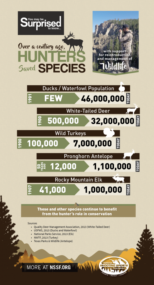 NSSF invites you to use the “You may be Surprised to know … hunters saved species” infographic to educate the public about the restoration of many animal species.
