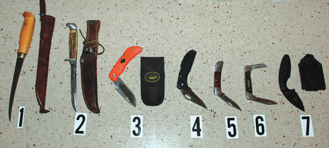 The smaller knife 5 is carried in the pocket while the others may be in a backpack or a pouch on the belt. Lock back knives are very popular with sportsmen as the feature is an excellent hand protector. The design features that the court indicates may define a weapon also make them popular and effective tools for sportsmen.