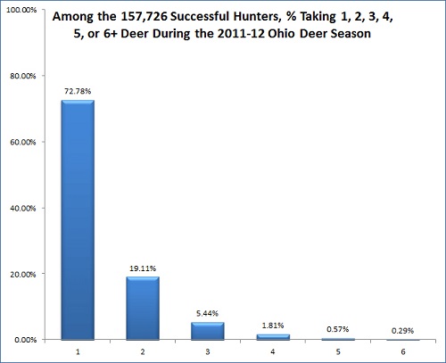 Many hunters wonder how many deer an average hunter harvests in a year or how they compare to other hunters. It is a minority of hunters who actually consistently harvest deer each year. Approximately one third of Ohio’s deer hunters kill a deer in any year. During the 2011-2012 season with liberal bag limits, 157,726 people successfully killed one deer. Of the successful hunters, almost 73%, took just one deer. About 19% killed two deer, followed by 5.4% killing three, 1.8% taking four, 0.57% taking five, and a mere 0.29% harvesting six or more deer. It seems that liberal bags limits, certainly anything above a three deer limit, may not have much management impact.