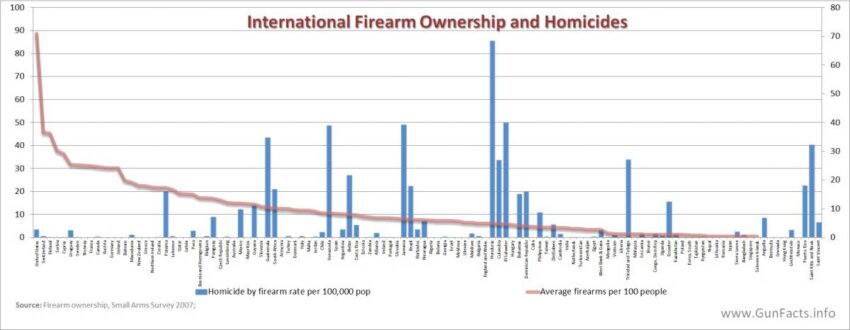 The question that comes immediately to mind is “Where is the most gun violence in the world?” Over at the Gun Facts website they have a separate chapter devoted to guns and violence in other countries, and one of the more interesting images explaining it all. Off on the left of the chart is the United States, which indeed has the largest number of privately owned firearms anywhere (the red line is what frightens uneducated people, which includes a few elected officials). The blue columns are the firearm homicide rates for each country.