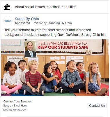 The Facebook ads feature a row of smiling schoolchildren sitting on a classroom floor beneath the words: "Tell your senator to vote for safer schools and increased background checks by supporting Gov. DeWine’s Strong Ohio bill."