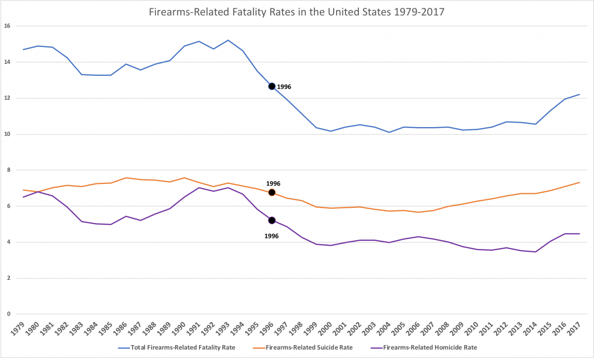Let’s look at the specific wording used in a recent article supporting gun control. “In 2017, the United States had the highest rate of firearm fatalities since 1996.” This statement is specifically crafted to make a dramatic point. The rate of all firearms-related fatalities in 1996 was lower than it was in the previous 15 years, and the rate was lower every year from 1997 through 2016. The data tell a clear story, even in the presence of a recent and moderate increase. Perhaps more importantly, the data shows that suicide is increasing as a percentage of all firearms-related fatalities.