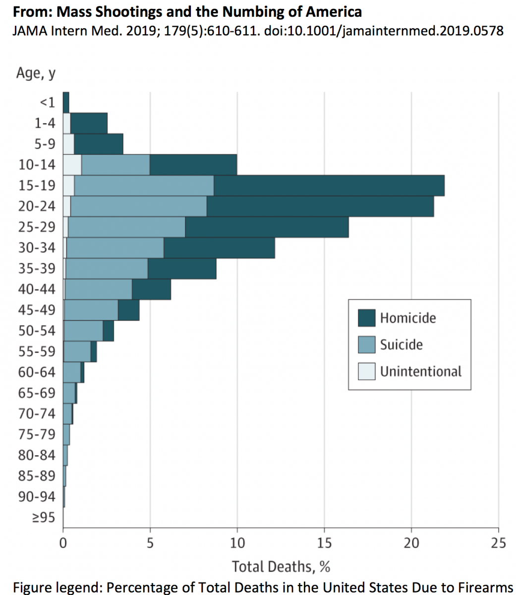 Not all charts are as clear. Some seem designed to support a certain perspective rather than to present data without bias. Doctor Eric Fleegler, affiliated with Harvard Medical School and Boston Children’s Hospital, recently published the above-referenced article titled, “Mass Shootings and the Numbing of America” in JAMA Internal Medicine. He presented firearms-related fatalities by age group and intent. The bars represent the percentage of all fatalities within that age group that involve firearms.
