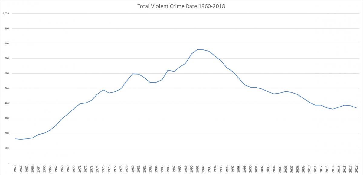 According to the report, violent crime rates hit a low point in 2014, marking the lowest point since 1970. The violent crime rate in 2018, by comparison, represented the third lowest rate since 1970. The following chart illustrates the data-proven, decreasing trend of violent crime: